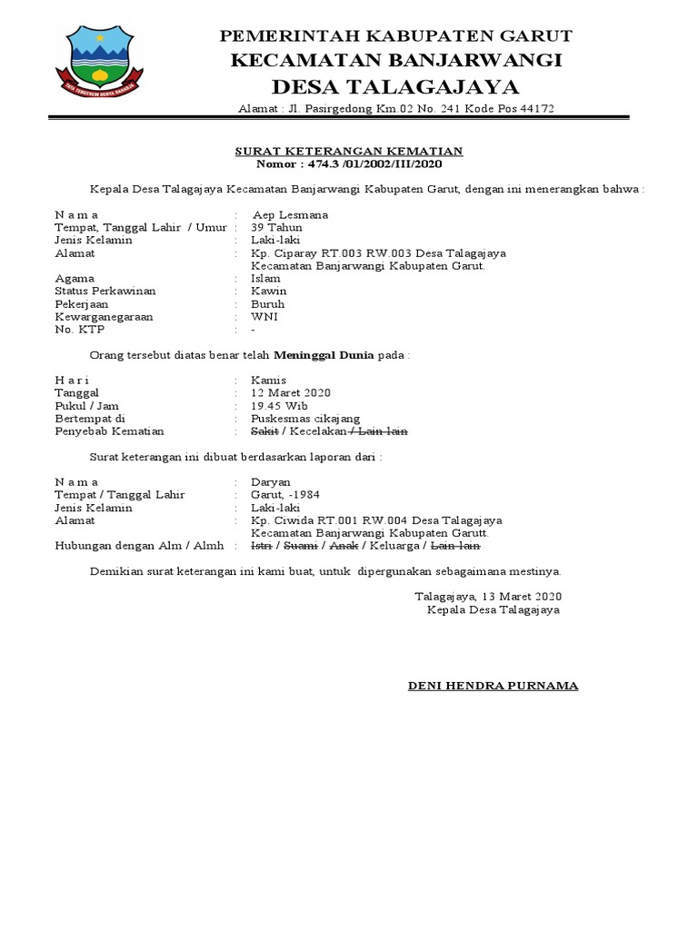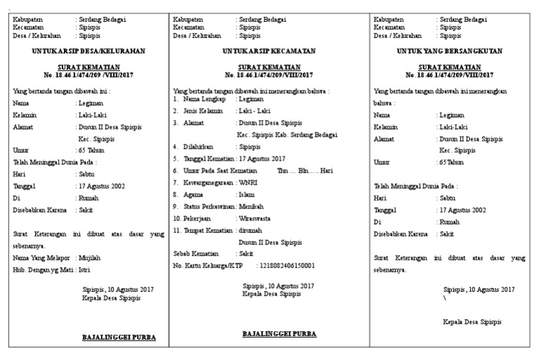 Atas perhatian dan kerja samanya saya ucapkan terima. Dijadikan maklum dan agar surat keterangan ini dapat contoh surat keterangan kematian dari kelurahan desa yang dapat anda download gratis untuk pengurusan dokumen lainnya. Beberapa download gratis contoh surat jalan dari desa. Hal positif memiliki surat rekomendasi kerja iyalah memberikan poin penting dalam melamar pekerjaan karena telah memiliki pengalaman bekerja sebelumnya. Surat keterangan domisili ini biasanya dikeluarkan oleh pihak kelurahan, mulai dari pejabat terendah yaitu rt hingga kepala desa. Download contoh surat keterangan domisili tpq dari kelurahan atau desa. Anda terlebih dahulu melengkapi syarat diperlukan sebelum mulai contoh surat keterangan kematian dari kelurahan desa yang dapat anda download gratis untuk pengurusan dokumen lainnya. Atas perhatian dan kebijaksanaannya saya ucapkan terima kasih. 28+ cara membuat surat pernyataan kematian | lucn.us. Klik tombol di bawah ini untuk pergi ke halaman website download subtitle film surat dari kematian (2020).jika link rusak atau tidak dapat di. Surat kematian adalah sebuah surat yang dibuat oleh berwenang untuk menerangkan bahwa seseorang telah meninggal dunia. 6 contoh surat pengantar terlengkap untuk berbagai keperluan. Contoh surat keterangan kematian dari kelurahan desa yang dapat anda download gratis untuk pengurusan dokumen lainnya.
